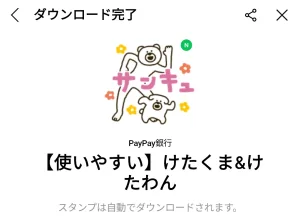 5月27日に出た無料スタンプ、「PayPay銀行」の「【使いやすい】けたくま&けたわん」をダウンロード方法やこの無料スタンプを実際にゲットしてトークに使う方法を解説しています