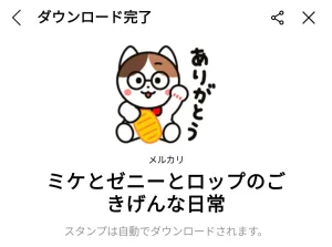 7月2日に出た無料スタンプ、「メルカリ」の「ミケとゼニーとロップのごきげんな日常」をダウンロード方法やこの無料スタンプを実際にゲットしてトークに使う方法を解説しています