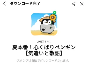 7月15日に出た無料スタンプ、「LINEスキマニ」の「夏本番!心くばりペンギン【気遣いと敬語】」をダウンロード方法やこの無料スタンプを実際にゲットしてトークに使う方法を解説しています