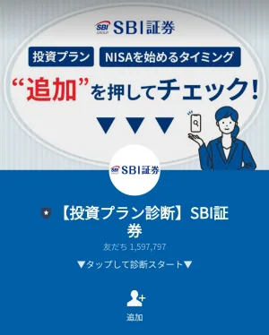 下のリンクからLINEを起動させて、「【投資プラン診断】 SBI証券」のアカウントと友だちになると無料でスタンプがGETできます☆