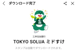 7月17日に出た無料スタンプ、「三井住友銀行」の「TOKYO SOLUA ミドすけ」をダウンロード方法やこの無料スタンプを実際にゲットしてトークに使う方法を解説しています