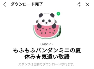 7月22日に出た無料スタンプ、「LINEバイト」の「もふもふパンダンミニの夏休み★気遣い敬語」をダウンロード方法やこの無料スタンプを実際にゲットしてトークに使う方法を解説しています