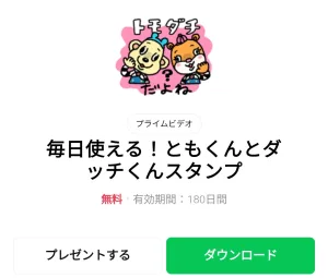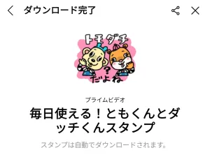 7月28日に出た無料スタンプ、「プライムビデオ」の「毎日使える!ともくんとダッチくんスタンプ」をダウンロード方法やこの無料スタンプを実際にゲットしてトークに使う方法を解説しています