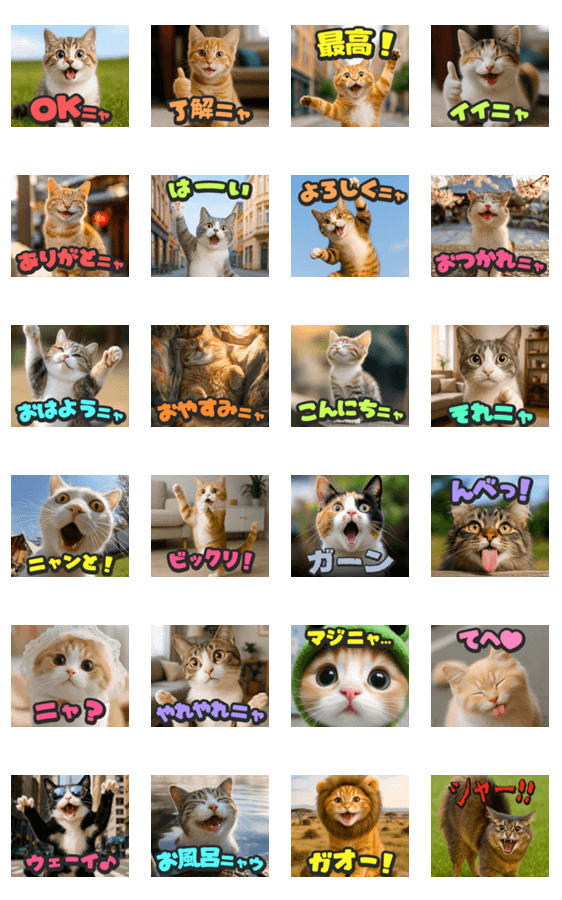 本スタンプはスタンプクリエイター・セイコウさんのオリジナルスタンプ。リアルな描写が特徴のアニメーションスタンプです。本作は表情豊かな猫たちが画面いっぱいに飛び出すポップアップスタンプ仕様となってます。