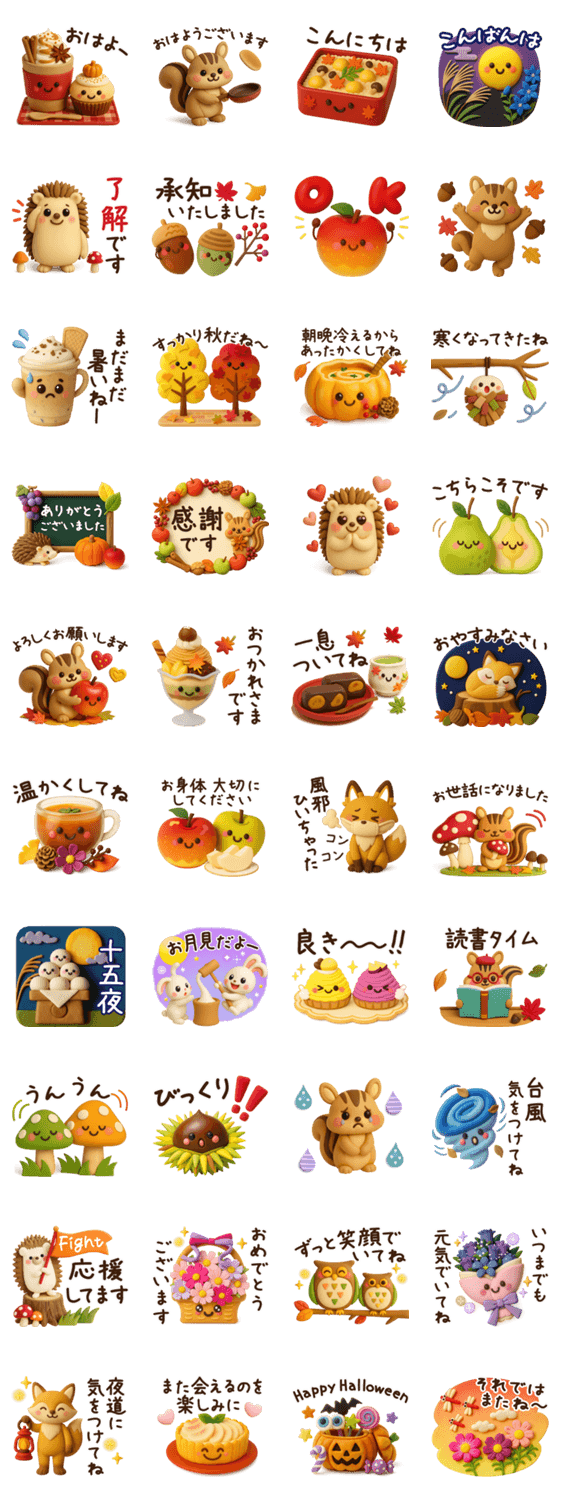 秋冬に毎日使えるかわいい日常スタンプ♡ほっこり立体バージョン♩挨拶敬語多め♪紅葉/秋スイーツ/敬老の日/お月見/十五夜/ハロウィン/可愛い/寒い/リス/きつね/シニア/3D