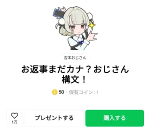 本スタンプは吉本おじさんのボカロ曲「お返事まだカナ?おじさん構文!」をモチーフとしたオリジナルスタンプ。ボーカロイド・雨衣のモデルとなったしぐれういさんがカバーしたことでも話題となりました。