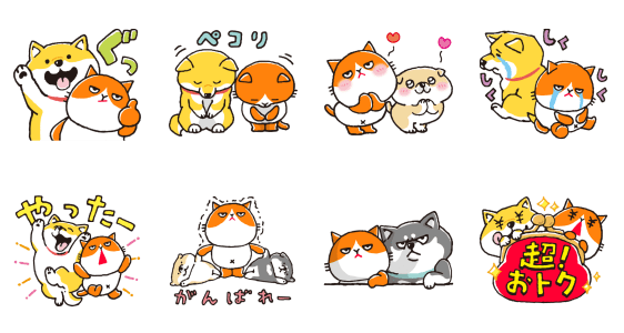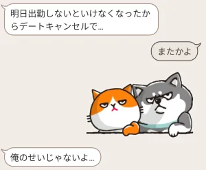 ふて顔にゃんことにこにこわんちゃんのかわいいコンビスタンプです♪