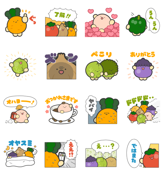 とまとやたまねぎなど、個性豊かなべじまるたちによる賑やかなスタンプです☆