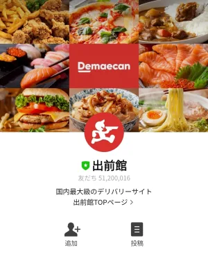 下のリンクからLINEを起動させて、「出前館」のアカウントと友だちになると無料でスタンプがGETできます☆