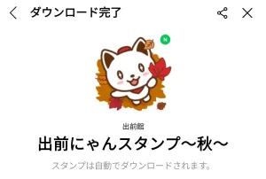 10月7日に出た無料スタンプ、「出前館」の「出前にゃんスタンプ~秋~」をダウンロード方法やこの無料スタンプを実際にゲットしてトークに使う方法を解説しています