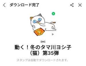 12月9日に出た無料スタンプ、「DHC」の「動く!冬のタマ川ヨシ子(猫)第35弾」をダウンロード方法やこの無料スタンプを実際にゲットしてトークに使う方法を解説しています