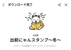 12月9日に出た無料スタンプ、「出前館」の「出前にゃんスタンプ~冬~」をダウンロード方法やこの無料スタンプを実際にゲットしてトークに使う方法を解説しています