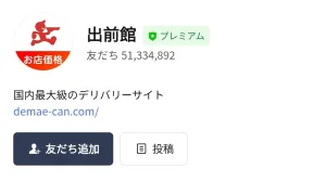 下のリンクからLINEを起動させて、「出前館」のアカウントと友だちになると無料でスタンプがGETできます☆