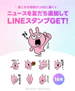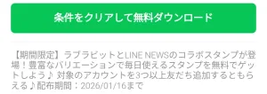 【期間限定】ラブラビットとLINE NEWSのコラボスタンプが登場!豊富なバリエーションで毎日使えるスタンプを無料でゲットしよう♪対象のアカウントを3つ以上友だち追加するともらえる♪配布期間:2026/01/16まで