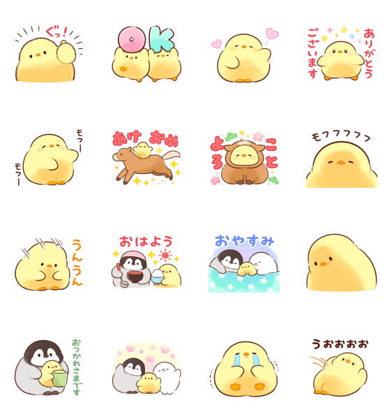 もふピヨはスタンプクリエーター・さんぽいもさんの代表作。ひよこをモチーフにしたキャラクターで、その名が示す通りまんまるもふもふとしたかわいい見た目で人気です。