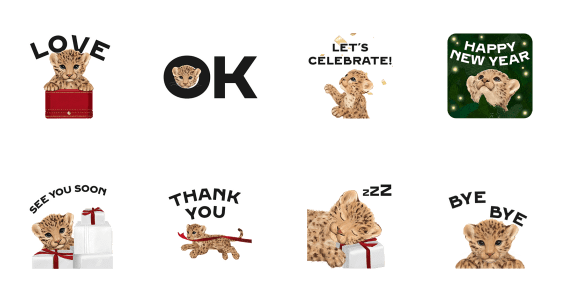 本スタンプはファッションブランド・カルティエのオリジナルスタンプ。2025年のホリデーシーズンに登場したベビーパンテール(赤ちゃん豹)がモチーフとなってます。赤ちゃんらしい無邪気でかわいい仕草がアニメーションで再現されています。
