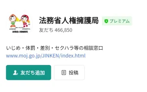 下のリンクからLINEを起動させて、「法務省人権擁護局」のアカウントと友だちになると無料でスタンプがGETできます☆