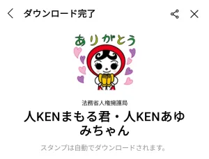 1月20日に出た無料スタンプ、「法務省人権擁護局」の「人KENまもる君・人KENあゆみちゃん」をダウンロード方法やこの無料スタンプを実際にゲットしてトークに使う方法を解説しています