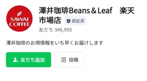 下のリンクからLINEを起動させて、「澤井珈琲Beans & Leaf 楽天市場店」のアカウントと友だちになると無料でスタンプがGETできます☆