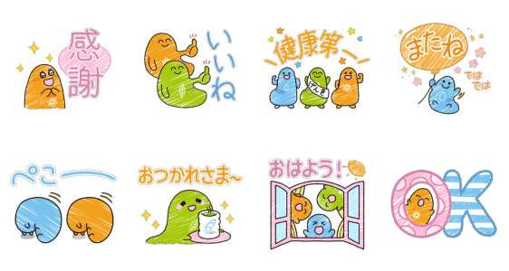 本スタンプは医療機器メーカー・コスモヘルスのオリジナルスタンプ。同社のマスコットキャラクターたちが集合したほのぼのスタンプです。
