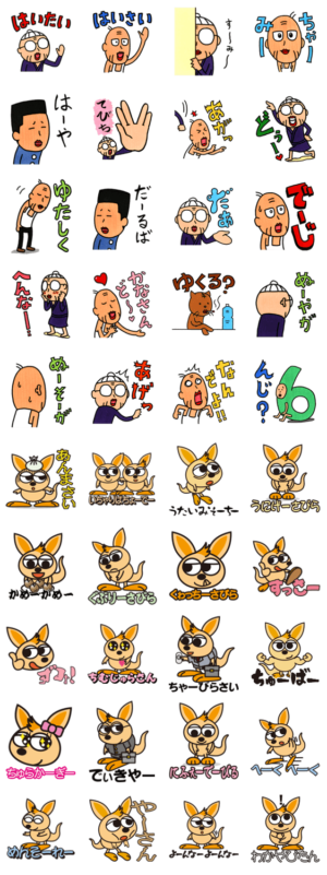 沖縄県の新聞「沖縄タイムス」紙面に登場するキャラクターたちの「うちなーぐち」スタンプ。ワラビー、おじぃ、おばぁ、はーや先輩も!沖縄タイムス、大城さとし より発売