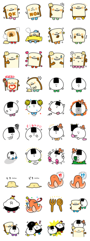パンとおにぎりのおいしそうなスタンプだよ。相棒のウィンナーとバターも一緒。ナガノ より発売