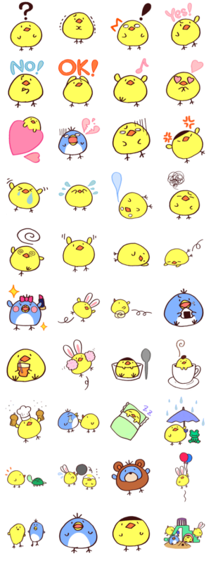 きいろい”ひよこ”と、おにぎり好きの”もののけ”、うさぎの耳がはえている”てばさき”、おこりん坊の”プリン”。「ひよこのこ」たちの、日常で使えるスタンプ。みゆたんこぶ より発売