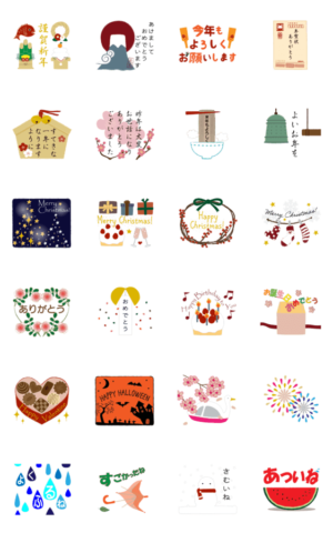 冬だけでなく夏も毎年使える動くスタンプ。お正月、クリスマス、年末、誕生日、バレンタイン、ハロウィン、花火大会、お花見などのイベントのトークに!