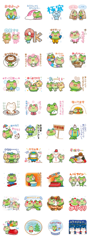 かえるちゃんシリーズ冬のスタンプです。寒い冬のお天気やクリスマスも盛りだくさん!coyuri より発売