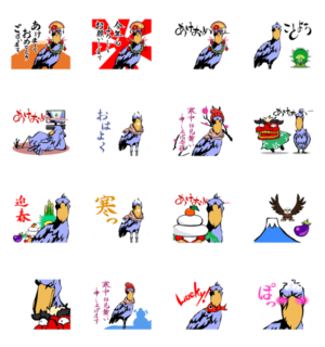動かない鳥ハシビロコウのスタンプ。 新年のあいさつや冬の日々の挨拶もあり、毎年使えます。 2018年の年末年始版をお買い上げの方は内容が重複しますのでご注意ください。かも鍋天国 より発売