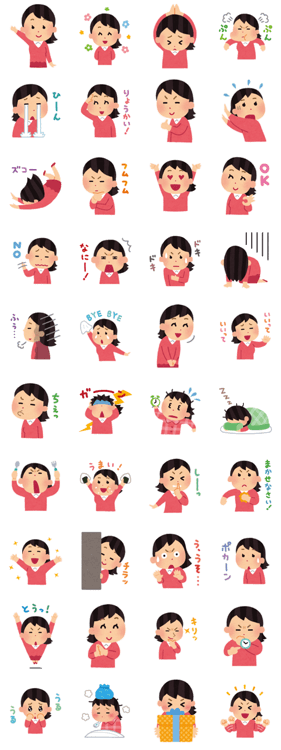 イラストサイト「いらすとや」で描いている女の子が、いろいろな可愛い表情をしているスタンプです。