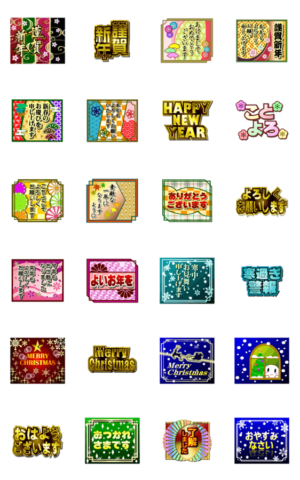 謹賀新年など年賀やクリスマスなど年末年始の挨拶を中心におはようからおやすみ、寒中見舞、冬をテーマに金文字や和風で飾った少し大人向けの落ち着いた華麗なスタンプです