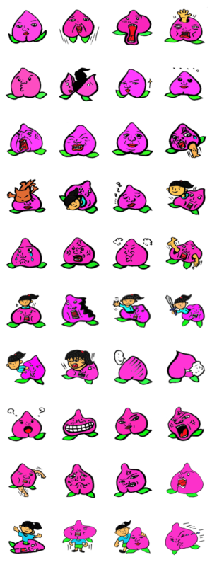 手書きで書いた絵に、パソコンで色を塗り、昭和と平成が合体したようなタッチの、岡山のモモ!あの桃太郎もビックリのスタンプをどうぞ。Last Chance Yuu より発売