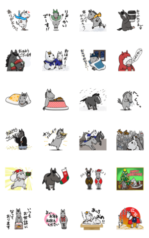 クリスマス・年末年始・冬っぽい白・黒・グレーの芦毛のお馬さんたちのアニメーションスタンプ。みなぱる より発売