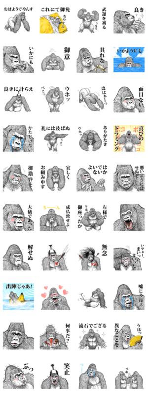 おちゃめなゴリラの「武士語」スタンプです。もふごり より発売