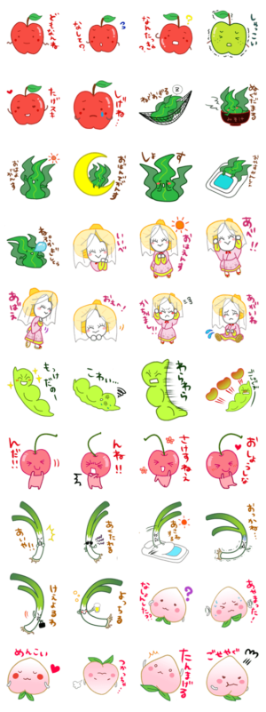 各地の名産品がキャラクターになって方言をしゃべるスタンプ。地元愛が深まります。 青森りんご/岩手わかめ/秋田お米/宮城まがりねぎ/山形さくらんぼ・えだまめ/福島もも