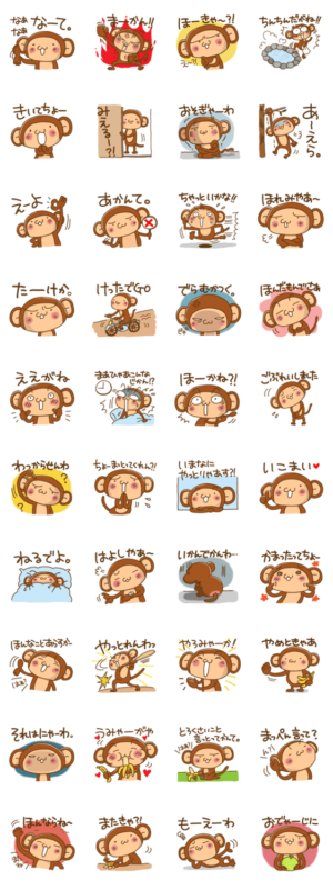 名古屋弁バリバリのおサルが今日もケッタでひた走る。名古屋人もそうじゃにゃあ人もぜひこのスタンプで盛り上がったってちょー。satoco より発売