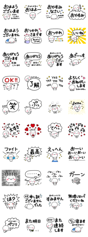 通常の基本言葉に気持ちが伝わるよう文字を追加したしろまるスタンプ第二弾です。内容を厳選し、これ一つで気持ちが全部伝わるよう作成致しました。【作:いしいともこ】