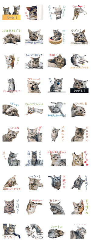 サバトラ猫の仲良しきょうだいエルとムゥのスタンプです。キムラプレミアム より発売