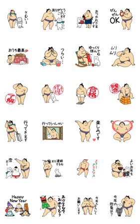 かわいい力士「おすもうちゃん」動くスタンプです。相撲大好きな方も、そうでない方も、クリスマス、お正月に楽しく使って日常会話を盛り上げてね。ねこもがんばってます。
