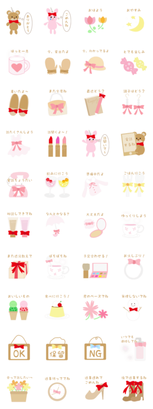ほんわかした色合いに、女子力UPなアイテムでスタンプを作りました。リボンを多く使用しており、可愛いものが好きな方にピッタリなスタンプです。夏目來実 より発売