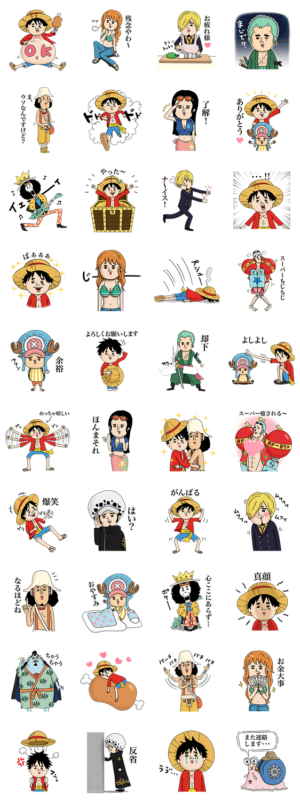 母からのメッセージでおなじみのイラストレーターナオコと「ONE PIECE」が奇跡のコラボ!いつもと違うシュールなルフィ達のスタンプでトークを盛り上げよう!