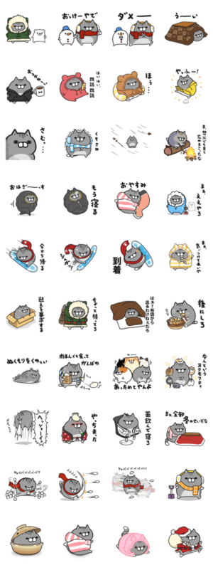 冬をテーマにしたボンレス猫のスタンプです! 冬っぽい見た目のもの盛りだくさんです。もふ屋 より発売