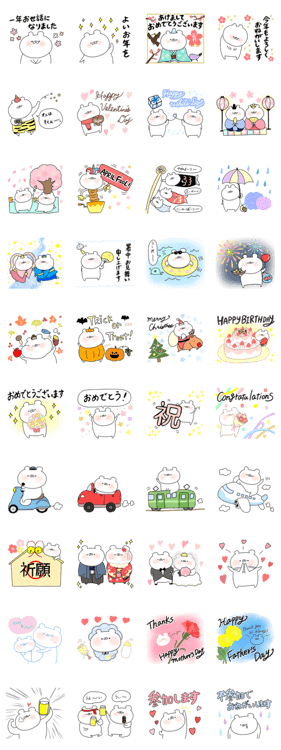 お正月、雛祭りお花見、梅雨、海花火、祭、ハロウィン、クリスマス、バレンタイン、ホワイトデー、お誕生日、飲み会、父の日、母の日七五三、成人式、季節のくまスタンプ!