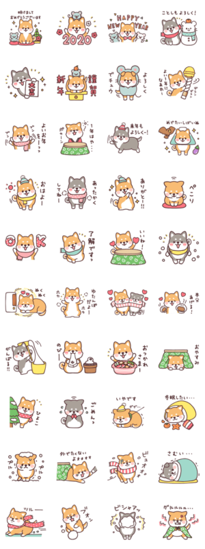 年末から2020年お正月の年賀状にも!干支のねずみも入ったころころ柴犬のスタンプです。お正月を過ぎても冬のスタンプとして日常で使える内容もたくさん入れました!つじなつみ より発売