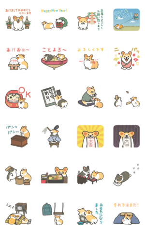 年末年始に使えるコーギーのスタンプです。年越しからお正月にかけてコギの成分が欲しくなったらお使い下さい。