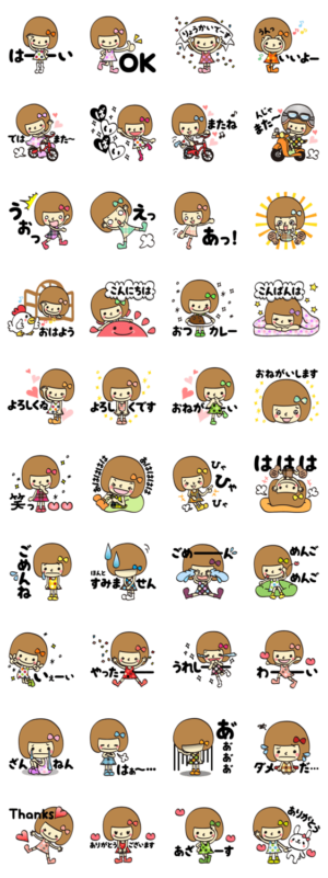 素敵なおかっぱ頭の女の子。パッツンが好きなあなたなら、一言入った文字入りスタンプを余すことなく使いこなせるわ。タメ口から敬語まで言い回し満載。是非使ってみてね。遠藤まめこ より発売