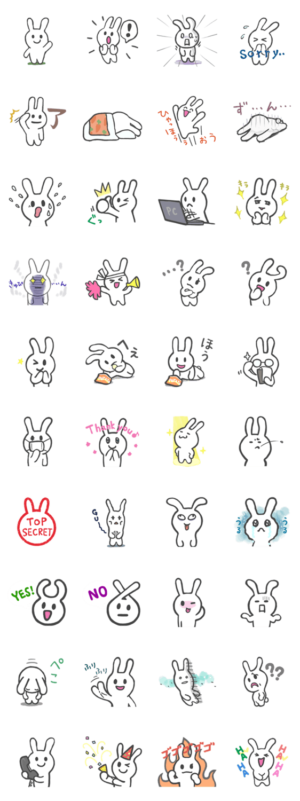 ゆるかわいいウサギの実用的ヘビロテ表情集(個人的データより作成)セリフ文字なし多数。喜怒哀楽のほか、ぺこりお辞儀、おめでとう、了解、応援、パソコン操作など。ほらほらたん より発売