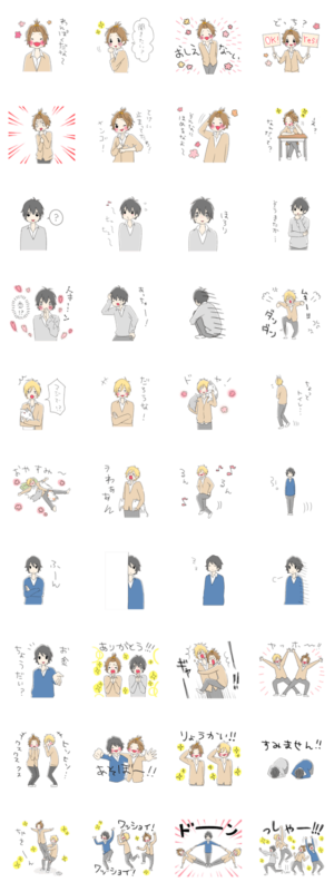 ハイテンションボーイ、純朴ボーイ、猫ボーイ、マイペースボーイの元気で仲良しな男子高校生たちのスタンプです。田ばた より発売