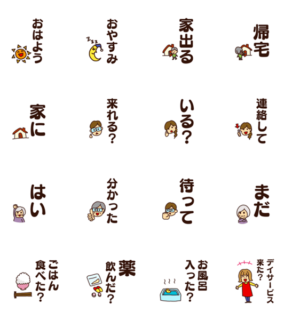 高齢者の方でも使いやすい家族間スタンプ第1弾【在宅介護編】です。背景は白く、文字は大きいデザインにしています。初めての方でもスタンプのみで会話が出来ますよ。